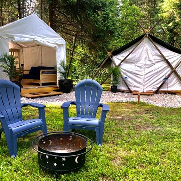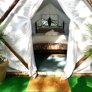 Coolest tent you ever did see! Imported from India, this spacious prospector tent comes complete with top of the line queen size, Kingsdown mattress, luxurious linens and a heated blanket. Tastefully decorated, a perfect end to a wonderful day of Glamping!