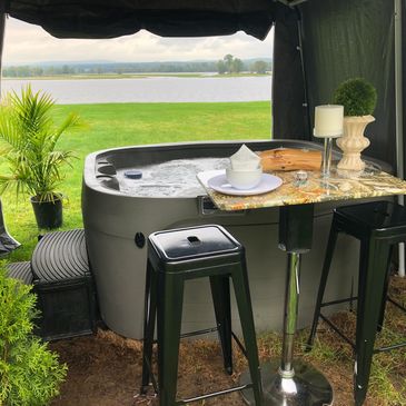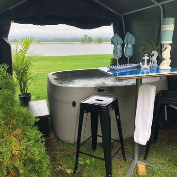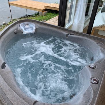 Yes, you have a private waterfront hot tub! For you only!! Enjoy a drink at your table, watch the amazing sunsets. Enclose the area for total privacy and protection against the elements. Also included, a place to charge your phone or devices. Just a 4 minute walk from your site. Don't forget the bathrobes!