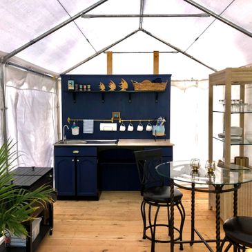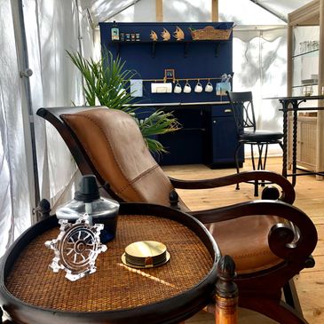 Glamping in the Captain's Quarters has a second tent. A comfy living room with high end furniture and a well equipped kitchen, complete with a cooler and running water. Six large windows roll up for a beautiful view, or can close during rain. Glamping with all the comforts of home!