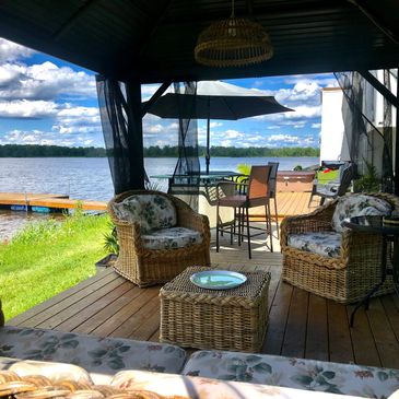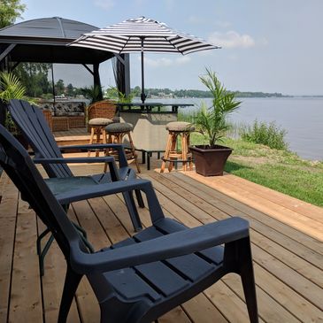 Tranquil Waterfront features a large deck, just steps away from the water. Large awning and the best seat in the house, your bar! complete with bbq, this is your happy place!!