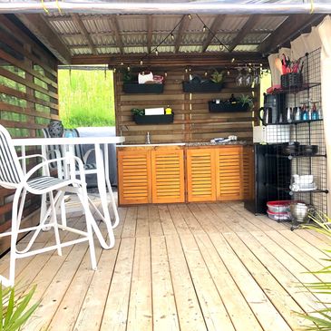 Unique and well equipped. This kitchen is awesome! Mini fridge, microwave, drip coffee maker, running water, bbq and dishes galore. Dinning here is truly a treat.