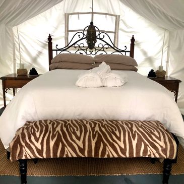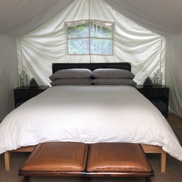 Coolest tent you ever did see! Imported from India, this spacious prospector tent comes complete with top of the line queen size, Kingsdown mattress, luxurious linens and heated blanket. Tastefully decorated, a perfect end to a wonderful day of Glamping!