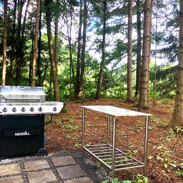 Every glamping experience needs a deluxe bbq area. This Nexgrill bbq has a side burner for all your cooking needs. An outdoor table and bbq utensils top it off!