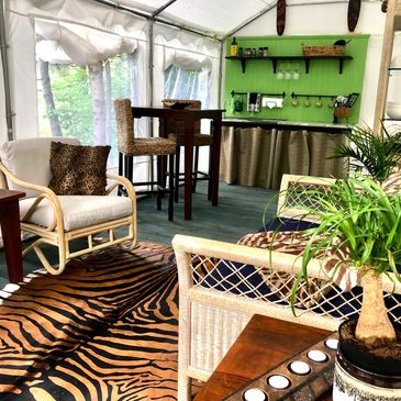 Glamping on a Safari has a second tent. A comfy living room with high end furniture and a well equipped kitchen area complete with a cooler and running water. Six large windows roll up for a beautiful view, or can close during rain. Glamping with all the comforts of home!